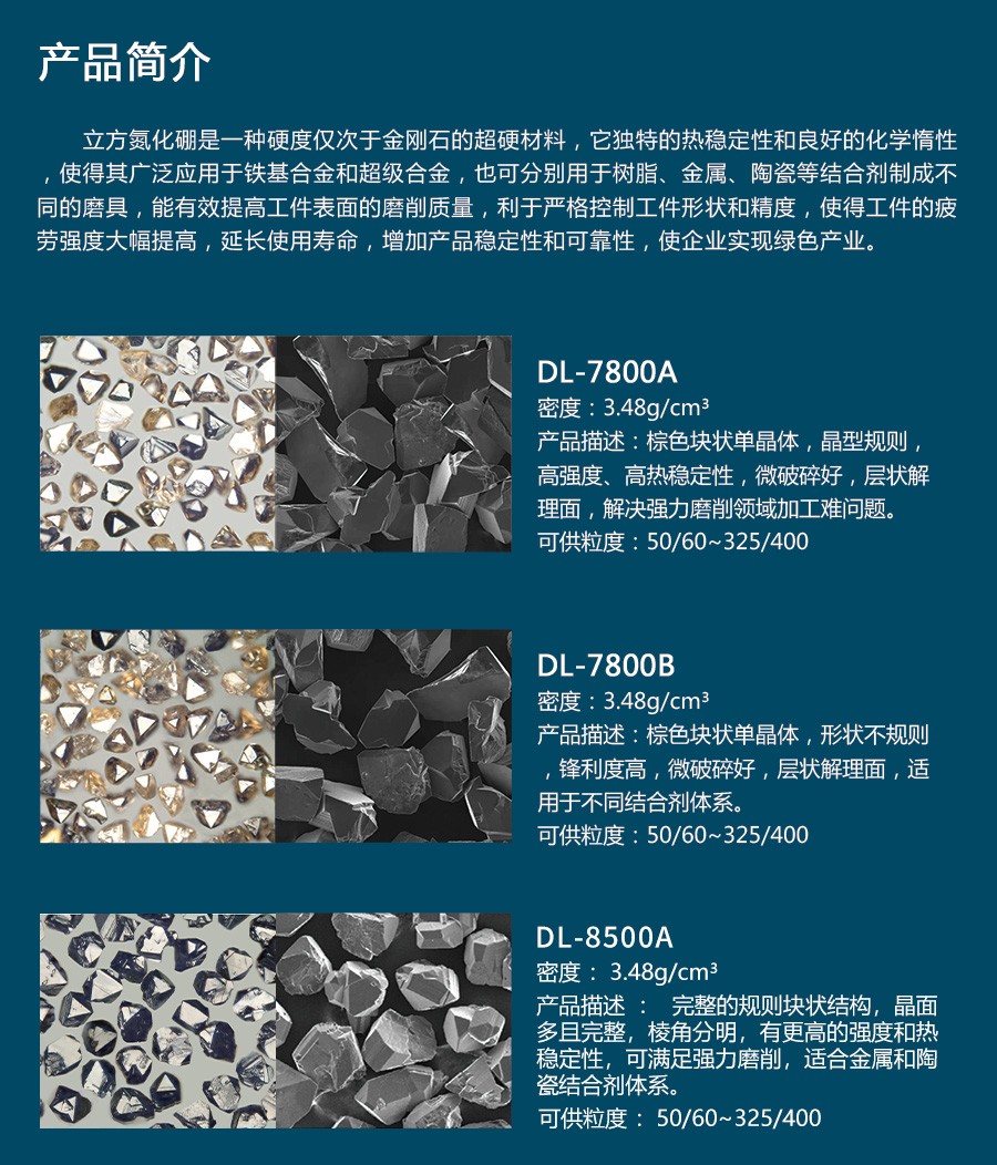 棕色塊狀單晶體,形狀不規(guī)則,鋒利度高,微破碎好,層狀解理面,解決了超硬工具高速、高效、強力磨削領(lǐng)域加工難問題。