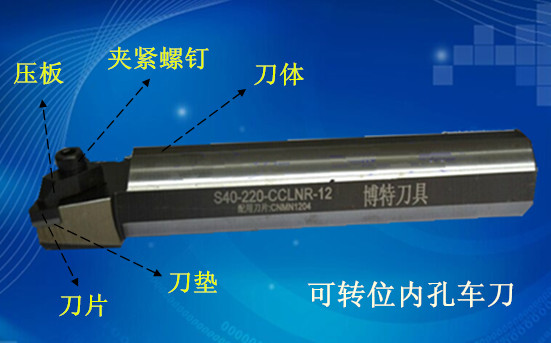 博特公司的CBN數(shù)控刀片以車外圓、端面、內(nèi)孔及切槽為主,所承載刀片的刀桿也是我公司自主生產(chǎn)的,適于鋼、鑄鐵的粗精加工,能承受較大的切削力,適于重切削。以博特內(nèi)孔車刀為例,我們簡單了解下可轉(zhuǎn)位刀具的每個部件。